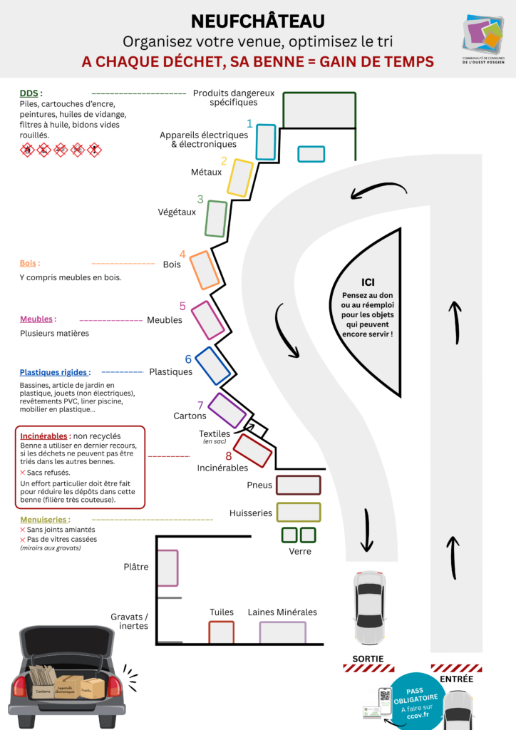 Ordre des bennes sur la déchèterie de Neufchâteau (de l’entrée à la sortie) : 1. Produits dangereux (DDS) ; 2. DEEE ; 3. Piles et batteries ; 4. Ampoules et néons ; 5. Métaux ; 6. Déchets verts ; 7. Bois MultiRep ; 8. Objets de la maison ; 9. Plastiques MultiRep ; 10. Carton ; 11. Non Recyclables ; 12. Pneus ; 13. Textiles ; 14. Menuiseries vitrées ; 15. Plâtre ; 16. Inertes ; 17. Laines Minérales